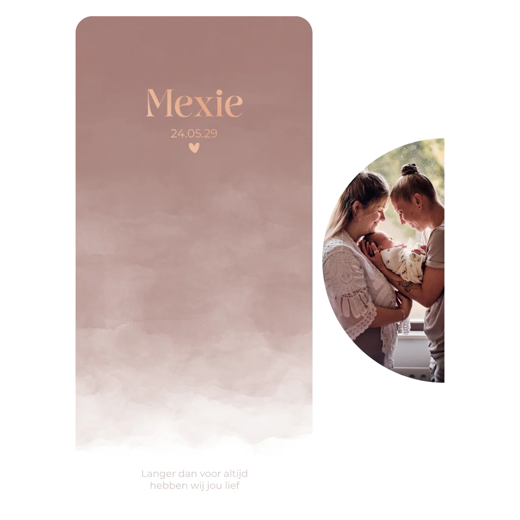 Dit staande geboortekaartje met fotolabel uit de Blush Cloud collectie combineert zachte oudroze watercolor tinten met een luxe rosegoudfolie afwerking. Het minimalistische ontwerp krijgt extra diepte door het losse fotolabel, waarop je een persoonlijke foto van jullie kindje toevoegt.