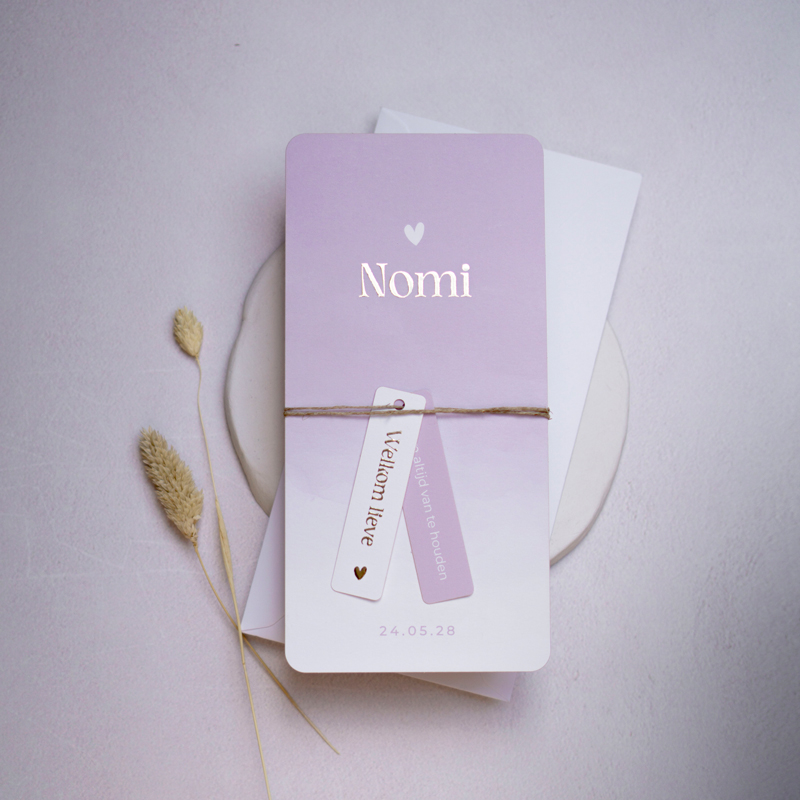 Ons geboortekaartje meisje lila met labels en goudfolie is een perfecte keuze voor ouders die op zoek zijn naar een uniek en opvallend geboortekaartje voor hun dochter.