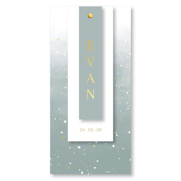 Grijsgroen label geboortekaartje jongen met goudfolie