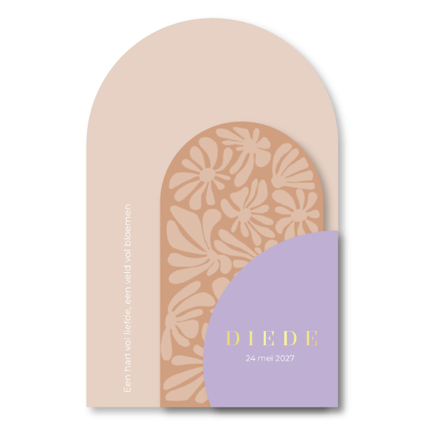 De naam en geboortedatum worden subtiel geaccentueerd met goudfolie, een luxe afwerking die prachtig combineert met de zachte kleuren van dit geboortekaartje. De speelse boogvorm en het bloemenpatroon maken dit kaartje extra bijzonder.