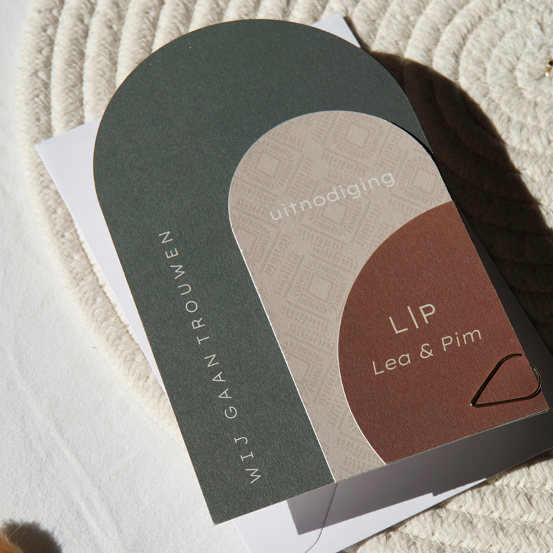 Label trouwkaart boog groen met glanskleuren. Deze prachtige minimalistische trouwkaart bestaat uit meerdere kaartjes en is toegepast met glanskleuren. Voeg de kaartjes samen met een mooie href="https://designstudio.lab1823.nl/paperclips/"target="_blank">paperclip. De de achtergrond, kleur en lettertypes pas je naar wens aan. Het formaat van de trouwkaart is 11x17 cm en past in een envelop van 12x18 cm.