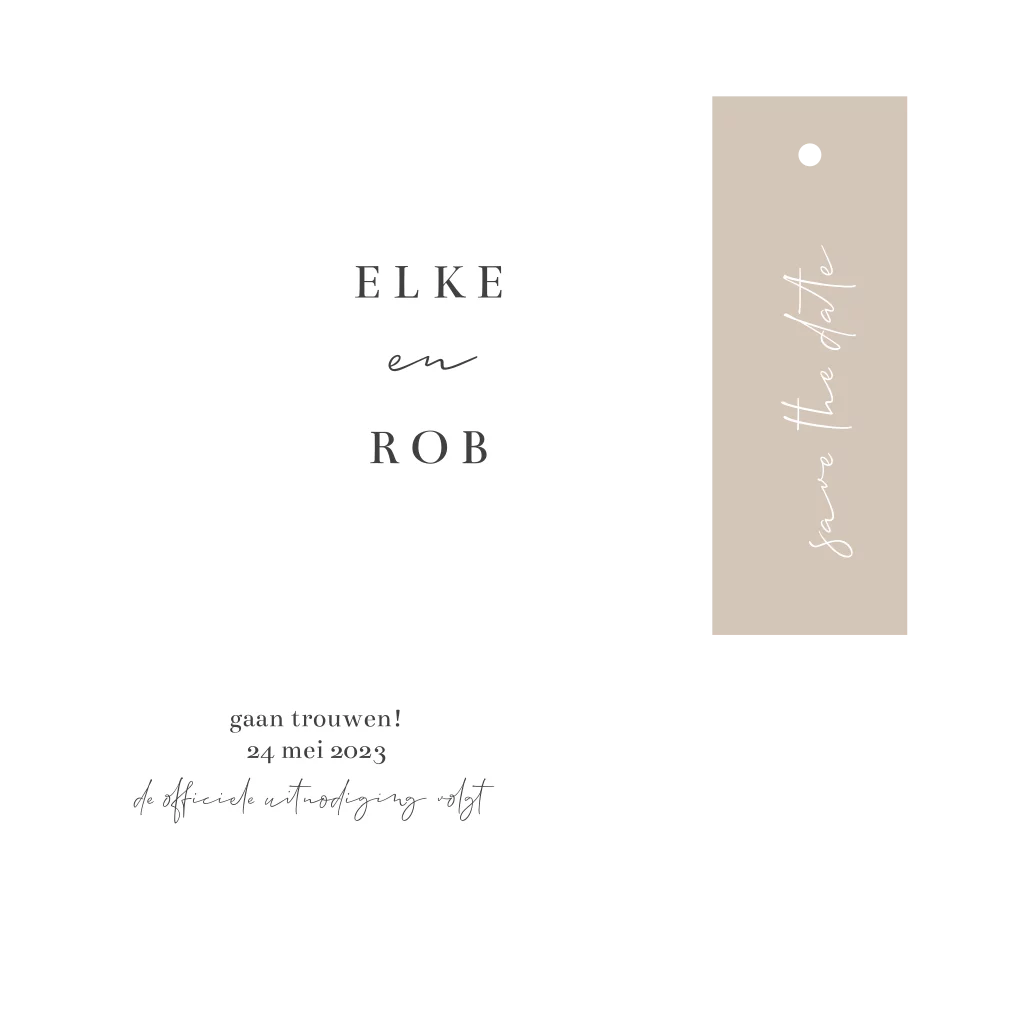 Laat je gasten weten dat jullie gaan trouwen en ontwerp zelf deze minimalistische save the date kaart met label. Je past de kaart eenvoudig naar wens aan in de online editor. Voeg de kaartjes samen met een mooi lint, touw of splitpen. De de achtergrond, kleur en lettertypes pas je naar wens aan. Het formaat van de trouwkaart is 11x17 cm en past in een envelop van 12x18 cm.
