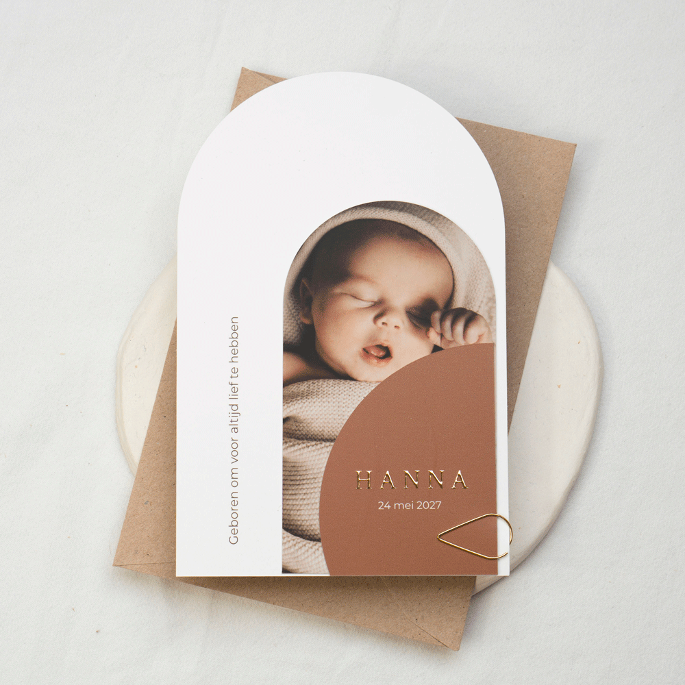 Dit prachtige modern label geboortekaartje bestaat uit meerdere kaartjes. Voeg de kaartjes samen met een mooie paperclip. De de achtergrond, kleur en lettertypes pas je naar wens aan. Het formaat van het geboortekaartje is 11x17 cm en past in een envelop van 12x18 cm. Foto: Manon Stevenaar Fotografie.
