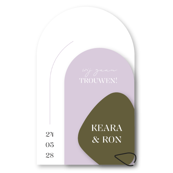 Deze stapelbare trouwkaart in boogvorm is uitgevoerd in lila, mosgroen en wit. Het speelse laagjesontwerp (formaat 10,5 x 17 cm) maakt de kaart uniek en stijlvol, terwijl de kleuren direct doen denken aan de bloeiende heidevelden.
