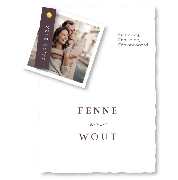 De trouwkaart is volledig aan te passen aan het thema van jullie bruiloft. Pas kleuren, lettertypes en achtergronden eenvoudig aan in onze online kaarteneditor. Creëer een uniek ontwerp dat naadloos aansluit bij jullie persoonlijke stijl en de sfeer van jullie grote dag.
