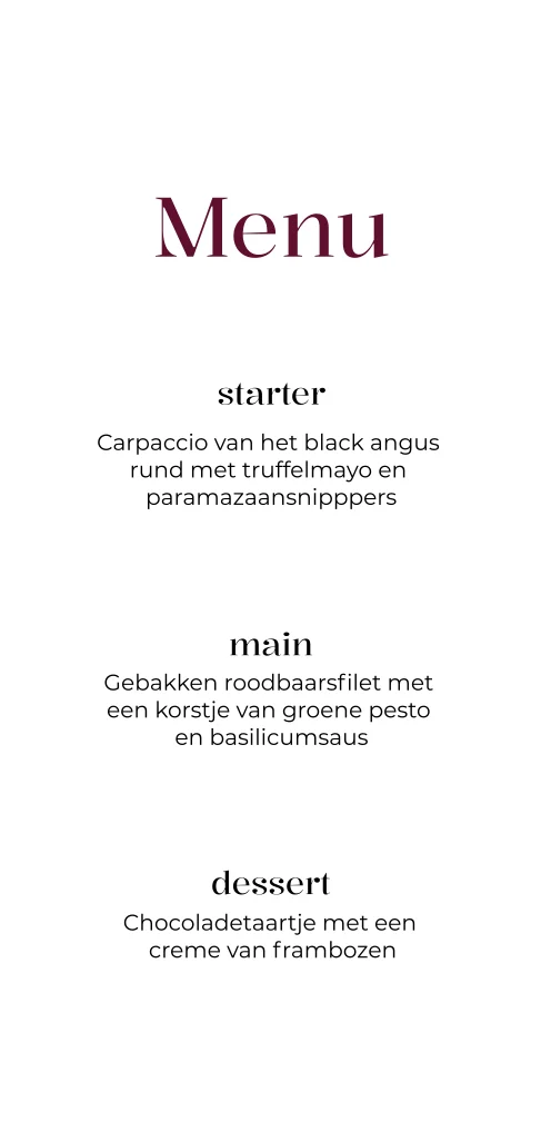 De menukaart vormt een prachtig geheel met de rest van de Love in Bordeaux collectie. Combineer met bijpassende naamkaartjes of een zijde chiffon lint in ecru voor een stijlvolle afwerking. Zo creëer je een warme, harmonieuze sfeer tijdens het diner.