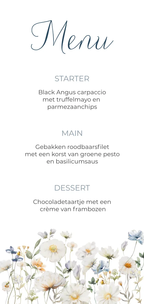 Maak jullie tafelsetting compleet met deze stijlvolle menukaart uit de Blooming Clarity collectie. De elegante bloemen langs de onderzijde geven de kaart een romantische en frisse uitstraling, perfect passend bij een luxe bruiloft.