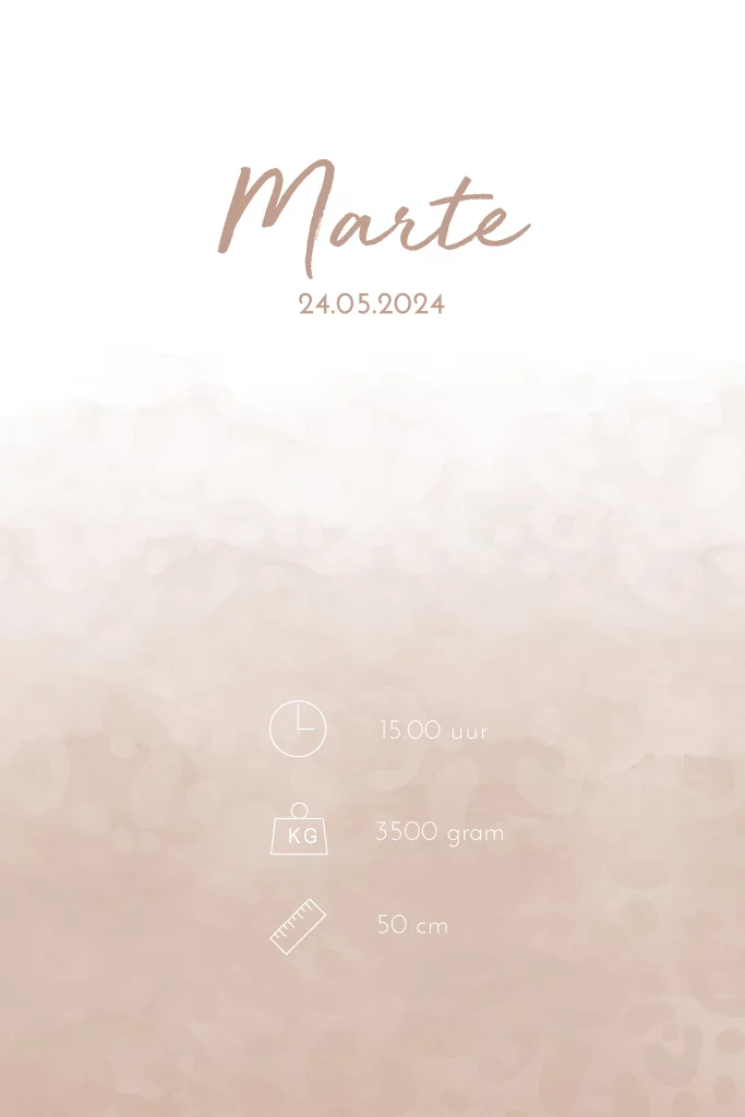 Ontwerp zelf je eigen poster. De achtergrond van deze geboorteposter heeft een mooie warme karamel kleurige watercolor verloop en een subtiele panterprint. De poster staat prachtig in bijvoorbeeld een kinderkamer of woonkamer. Een prachtig en uniek kraamcadeau. De achtergrond, lettertype en kleuren van deze poster kun je zelf naar wens aanpassen.