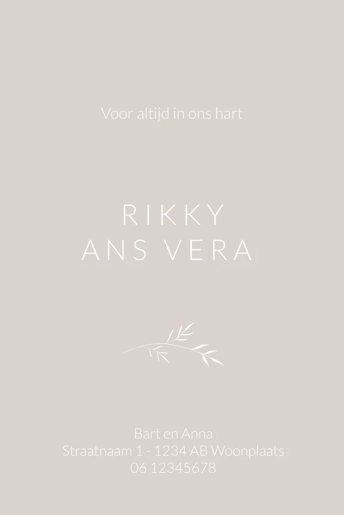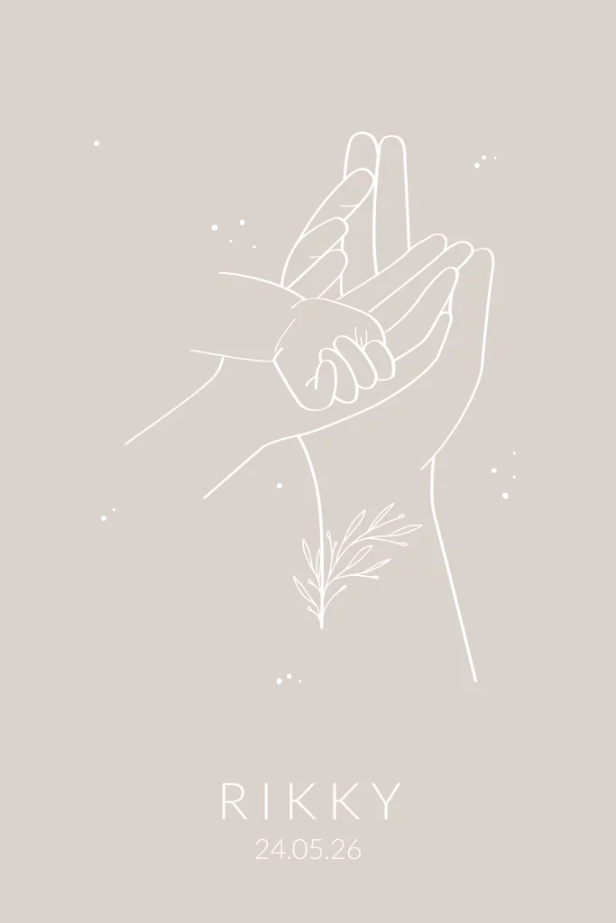 Zandkleurig baby rouw geboortekaartje met een prachtige handen line art illustratie en zilverfolie spettertjes. Je kunt de rouwkaart helemaal naar wens aanpassen.