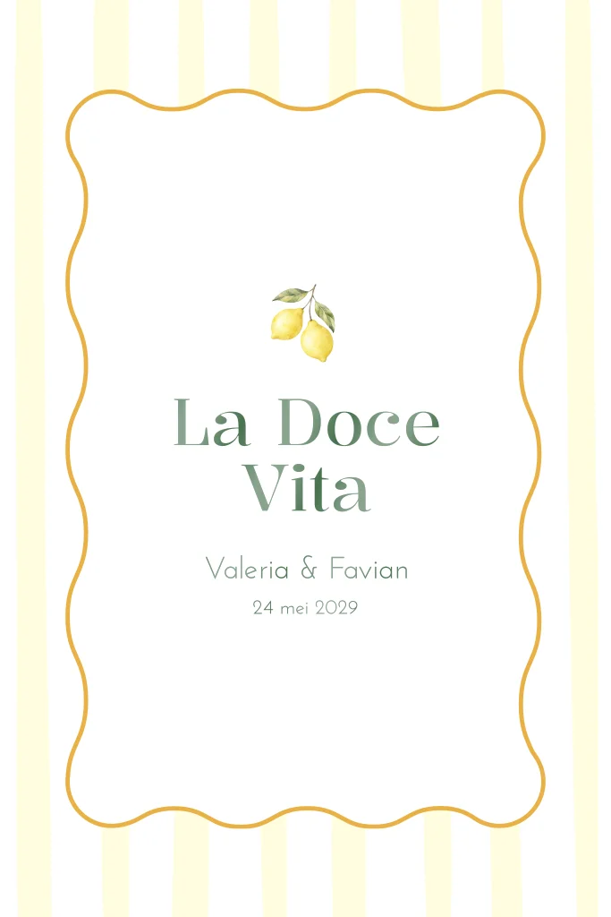 Met deze zomerse save the date kaart uit de Italian Summer collectie kondig je jullie trouwdatum aan op een stijlvolle manier. De kaart heeft lichtgele strepen en een citroentjes illustratie, waardoor je direct die frisse Italiaanse summer vibe neerzet.