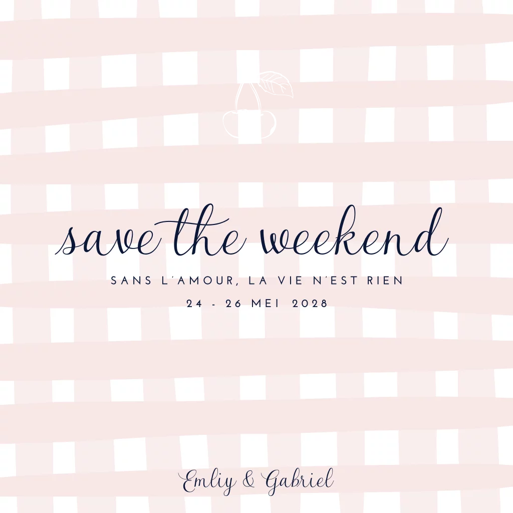 Geef jullie gasten alvast een voorproefje van de sfeer van de bruiloft met deze stijlvolle "Emily in Paris" save de date kaart met ruitjes en zilverfolie kers geïnspireerd door de romantiek en charme van de stad van de liefde.