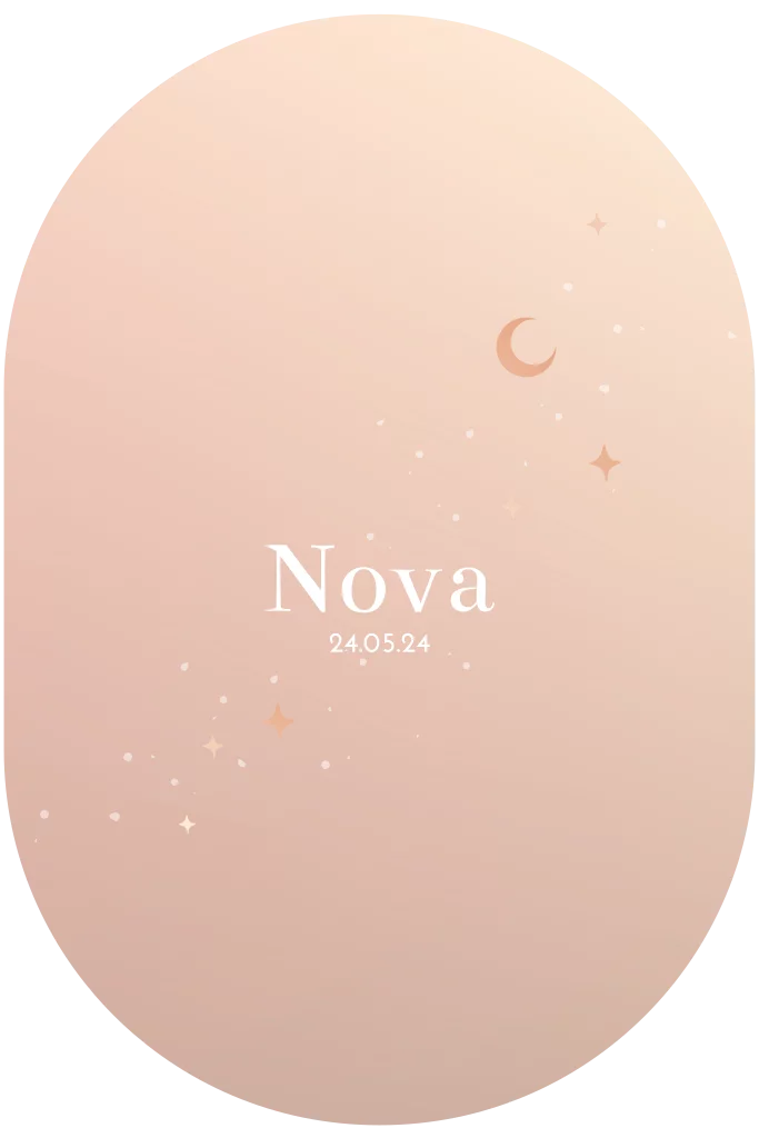 Ontwerp zelf het geboortekaartje voor een meisje in deze bijzondere ovaal vorm. Je je kunt de achtergrond, kleur en lettertype aanpassen. De voorbeeldnaam Nova en andere elementen zijn gedrukt in goudfolie maar pas je ook naar wens aan naar een andere kleur folie, standaardkleur of glanskleur