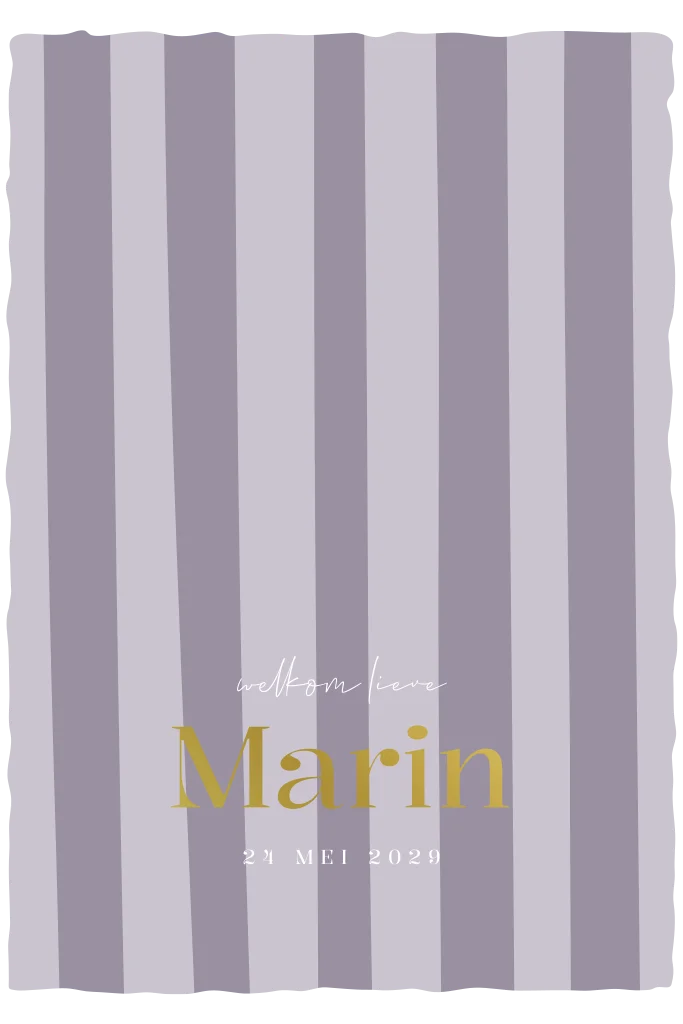 Dit stijlvolle geboortekaartje met zachte paars lila strepen en een naam in goudfolie heeft een warme, ambachtelijke uitstraling. De handgeschepte papier look geeft het kaartje karakter en zorgt voor een tijdloos ontwerp dat zowel modern als klassiek aanvoelt.