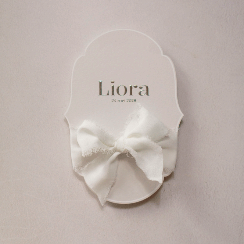 Een mooi zijden linten is een prachtige toevoeging aan dit geboortekaartje en maakt het ontwerp helemaal af!