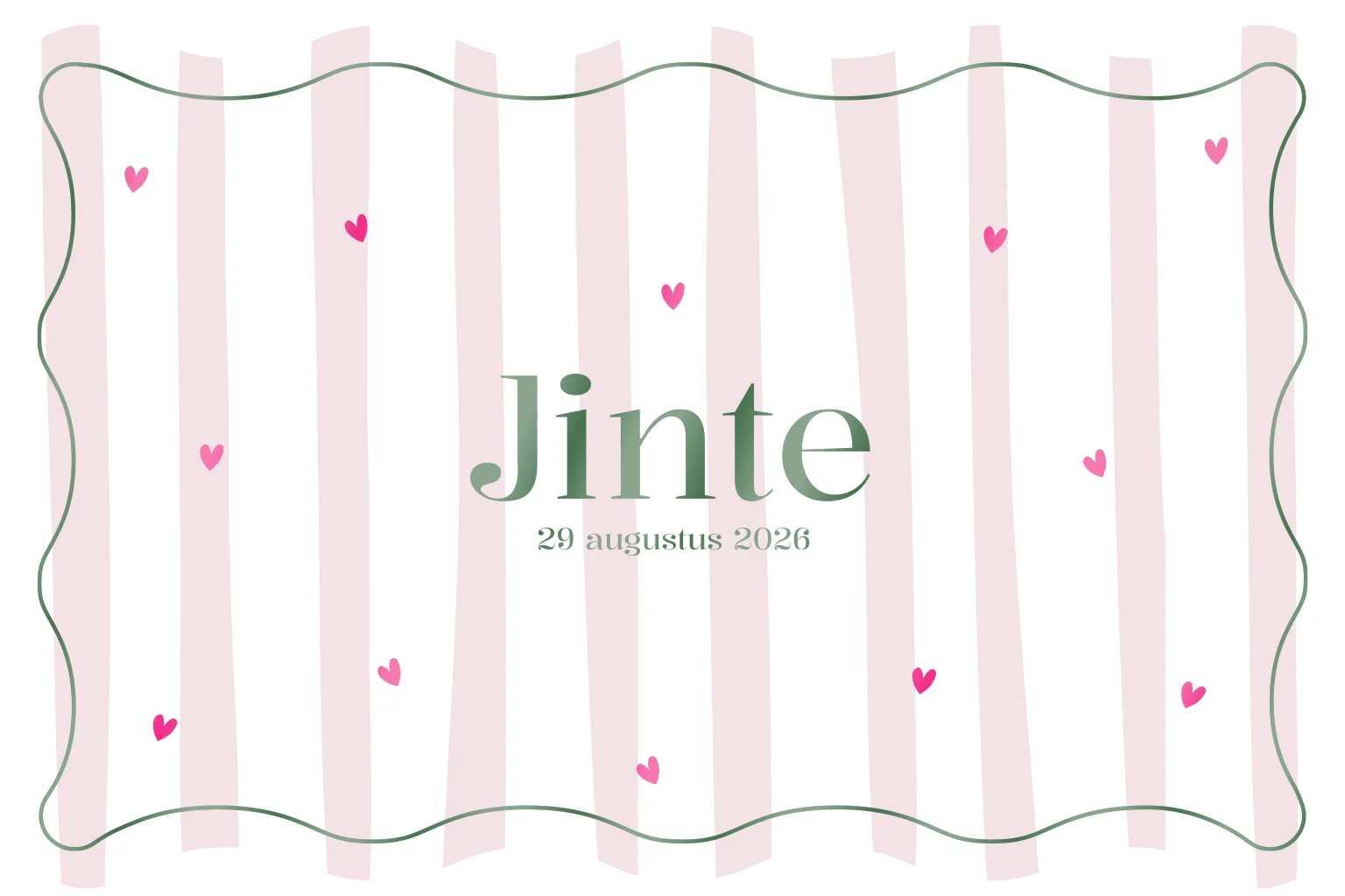 Dit geboortekaartje voor een meisje heeft een speelse en zachte uitstraling dankzij de golvende vorm en het frisse kleurenpalet van groen en roze. De strepen en kleine hartjes geven het ontwerp een lieve, vrolijke sfeer die perfect past bij de aankondiging van een geboorte.