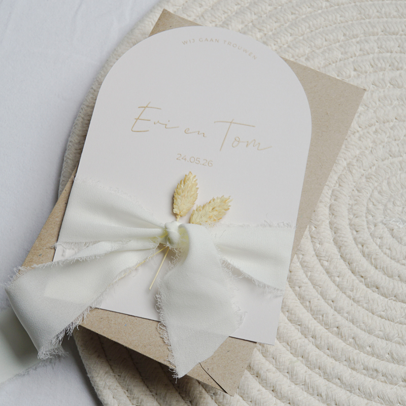 Als je op zoek bent naar een unieke trouwkaart, dan is deze halve boog trouwkaart met glanzende kleuren een perfecte keuze. Je kunt de kaart helemaal naar wens aanpassen en personaliseren, zodat hij precies aansluit bij jullie bruiloft. Bovendien kun je de kaart ook decoreren met een touwtje, fluweel lint en de leuke tassels . De trouwkaart kun je zelf helemaal naar wens aanpassen en personaliseren.