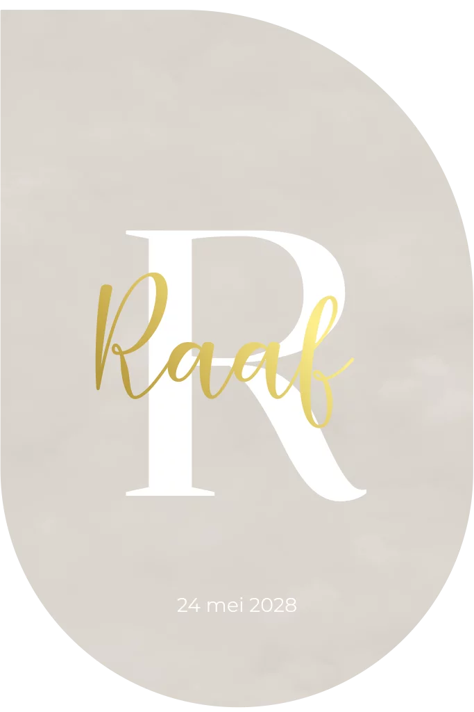 Dit elegante geboortekaartje in een moderne afgeronde druppel vorm straalt een vleugje luxe uit door gebruik te maken van goudfolie op een zacht beige achtergrond.