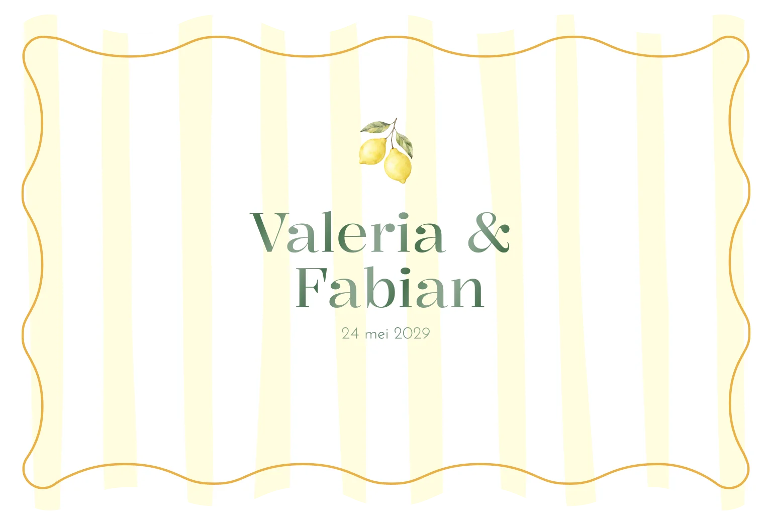 De hele collectie is ontworpen met lichtgele strepen en een subtiele citroentjes illustratie. Het kleurenpalet in lichtgeel, okergeel en groen geeft de trouwkaart een frisse, mediterrane sfeer die helemaal past bij een summer wedding. De glanskleuren geven de kaart net dat beetje extra luxe