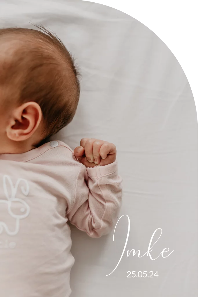 Ontwerp zelf het geboortekaartje voor jullie kindje. Een prachtig modern foto geboortekaartje met aan de voorzijde een uitgesneden ronde hoek. De hartjes en spettertjes aan de binnenzijde komen zo mooi te voorschijn. Je kunt de kaart helemaal naar wens aanpassen. Foto: Marloes van der Linde Fotografie.