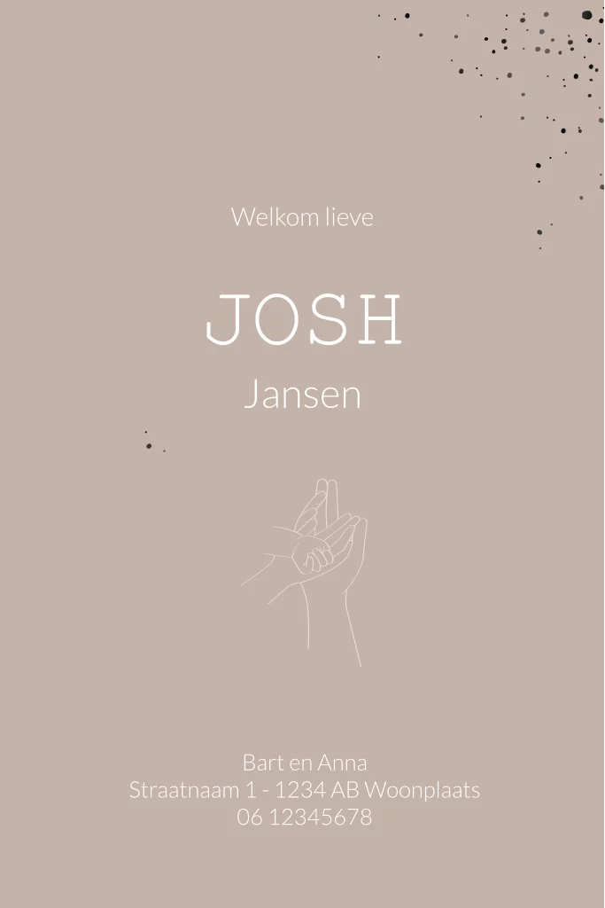 Ontwerp zelf het geboortekaartje voor jullie kindje. Een prachtig modern foto geboortekaartje met aan de voorzijde een uitgesnede ronde hoek. De zwartfolie spettertjes op de binnenzijde zijn mooi zichtbaar op de voorzijde. De voorbeeldnaam Josh en spettertjes zijn aangebracht in zwartfolie. Je kunt de kaart helemaal naar wens aanpassen. Foto: Marloes van der Linde Fotografie.
