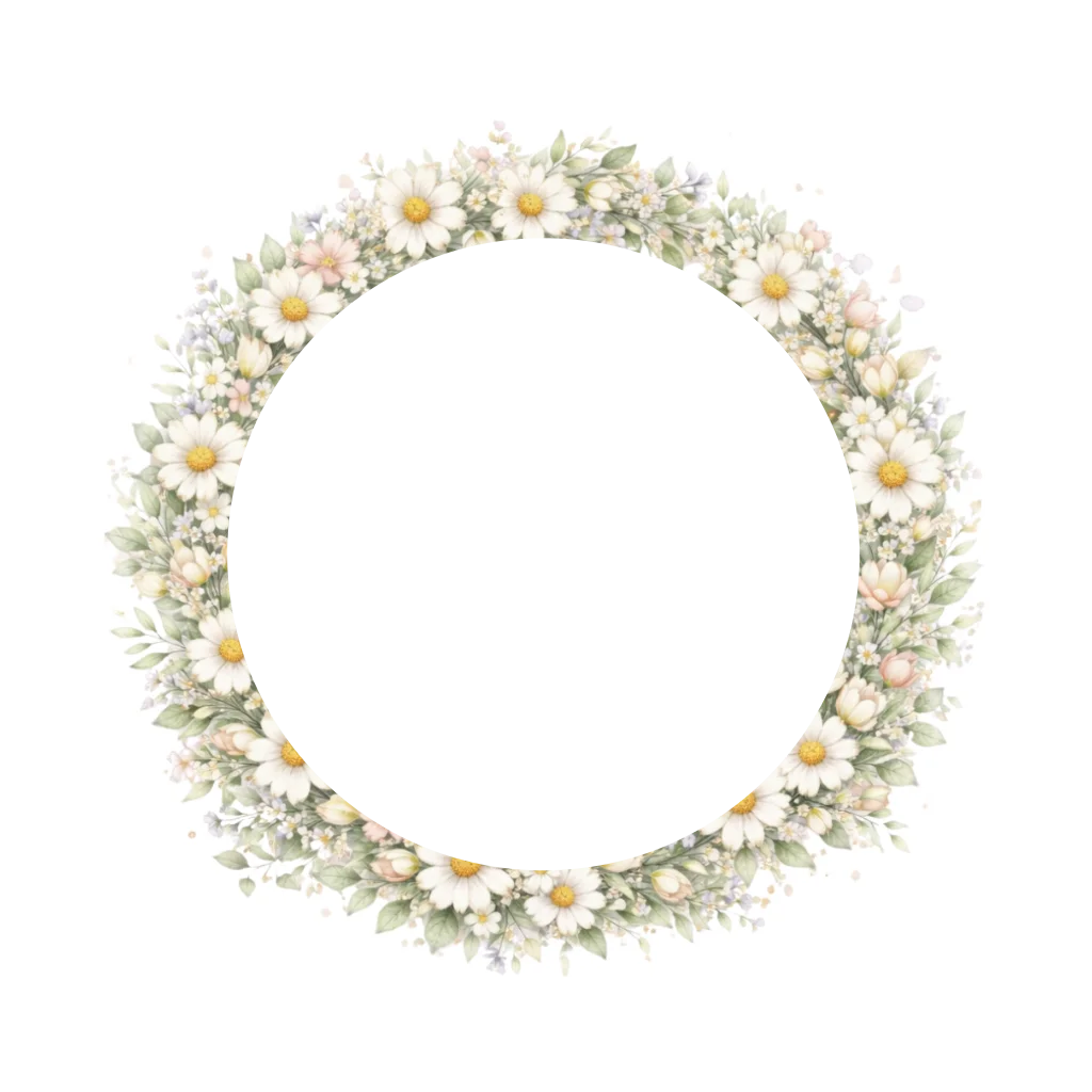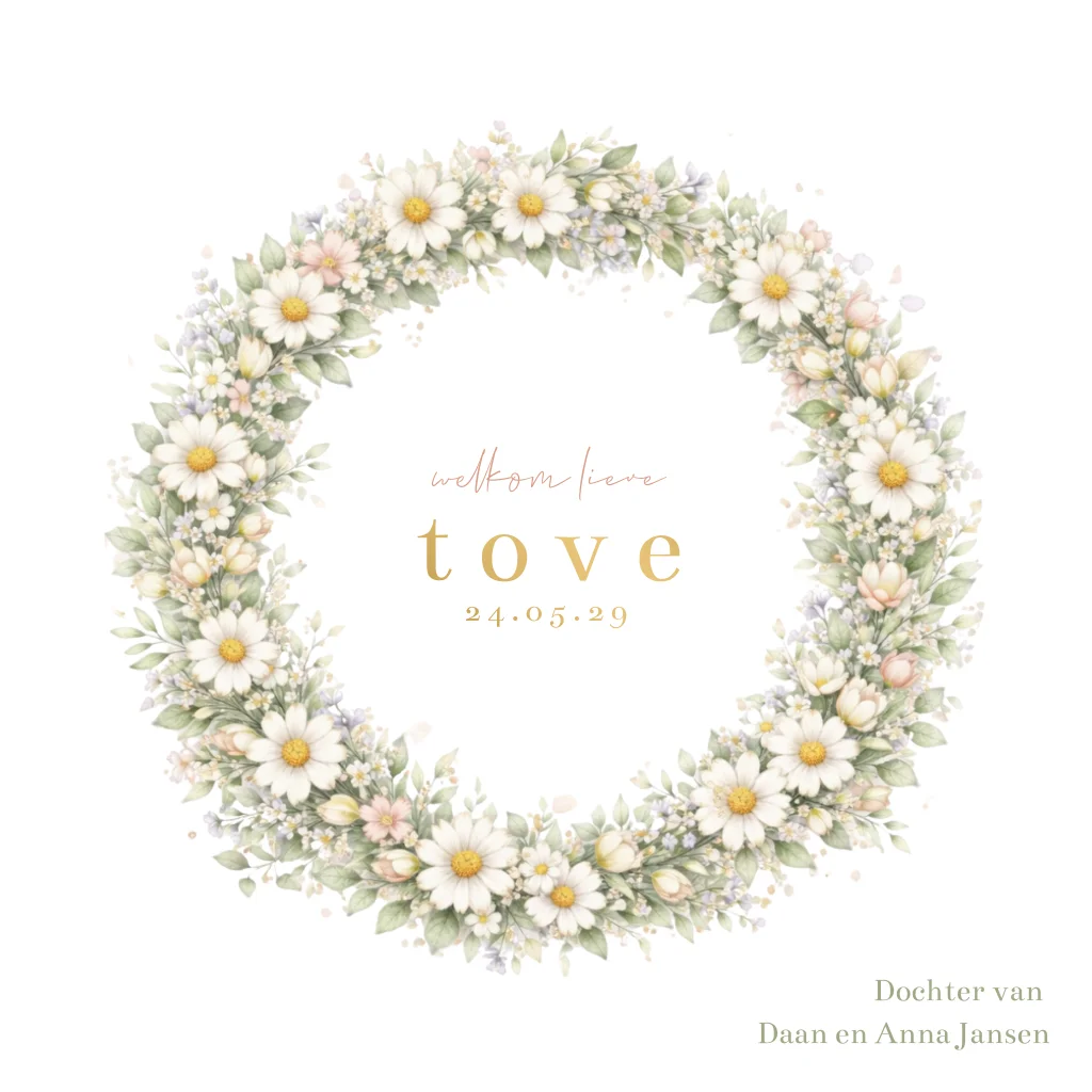 Dit lieve geboortekaartje voor een meisje is versierd met een zachte bloemenkrans vol prachtige bloemen en blaadjes. De madeliefjes, kleine bloemetjes en het frisse groen vormen samen een romantische krans die het kaartje een natuurlijke en dromerige uitstraling geeft.