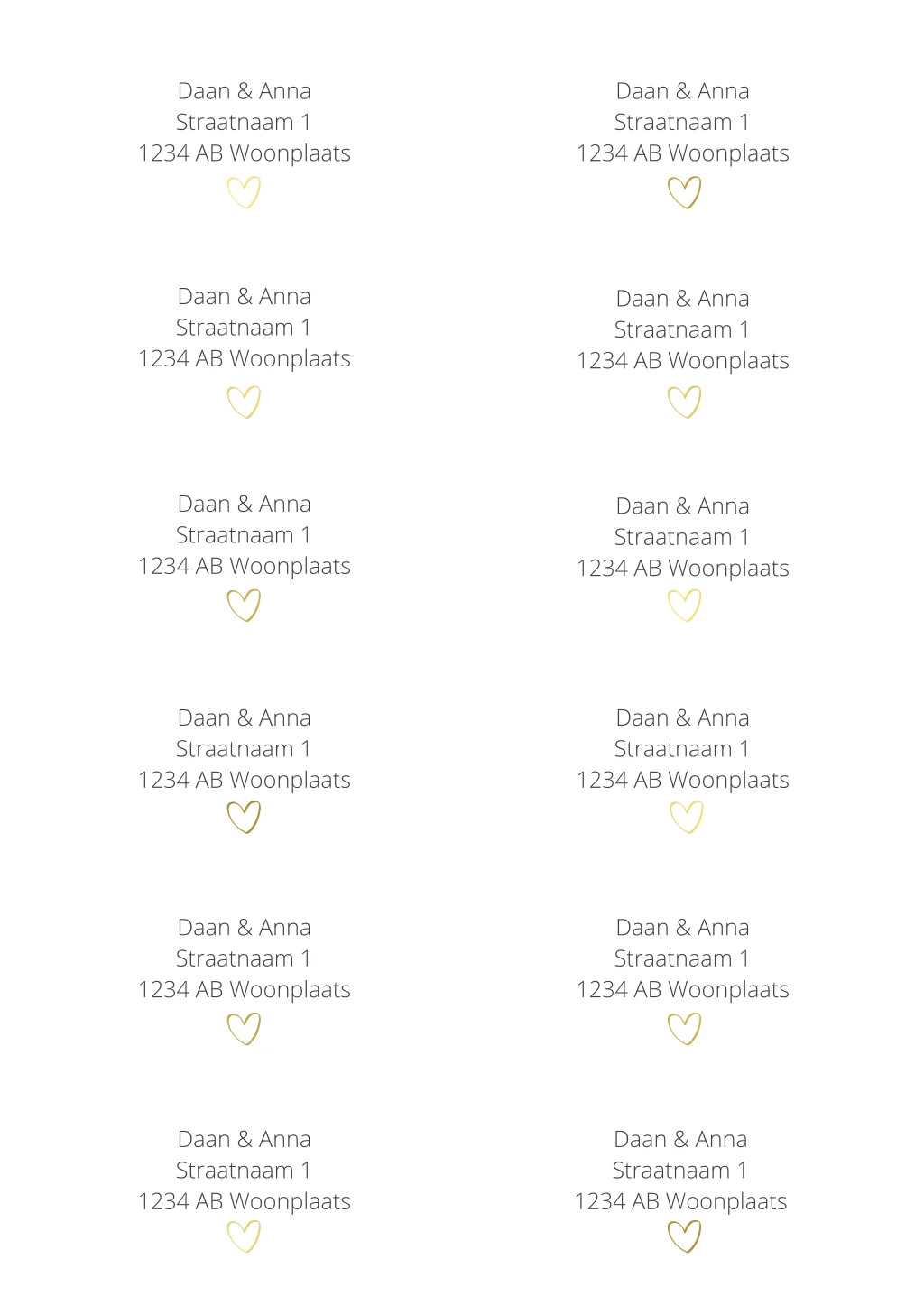 Deze stijlvolle adressticker met open hartje in goudfolie geeft enveloppen een warme en luxe uitstraling. Een subtiel detail dat prachtig combineert met een trouwkaart of geboortekaartje.