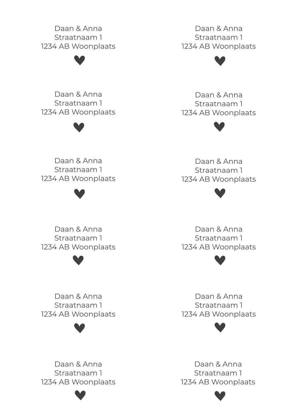 Je ontvangt 12 adresstickers per vel. Het formaat per sticker is 97x45 mm.