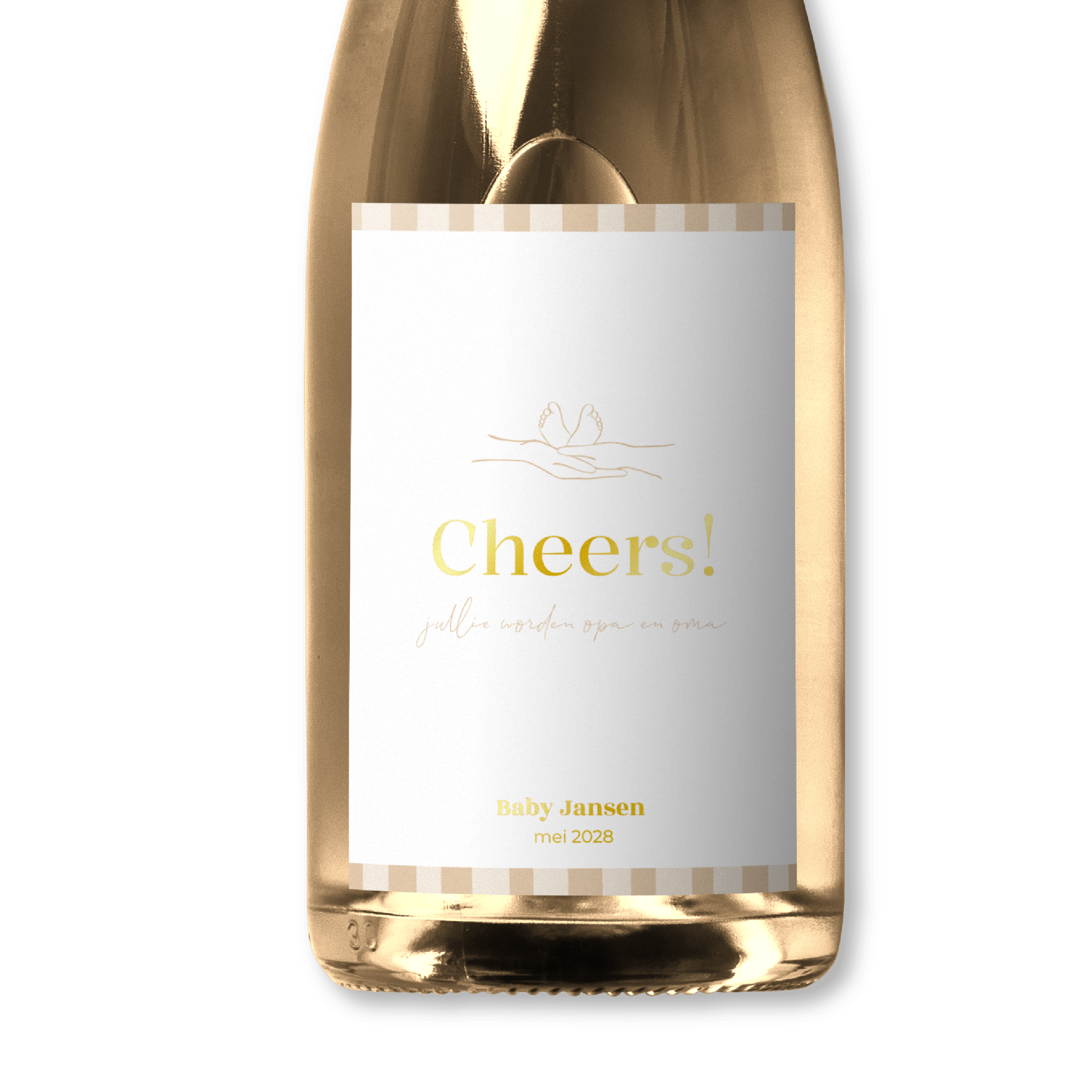 Maak jullie zwangerschap op een originele en stijlvolle manier bekend met deze prachtige champagne en wijnetiketten. De zachte neutrale tinten en subtiele goudfolie accenten geven elk etiket een warme en luxe uitstraling, perfect voor elk bijzonder moment.