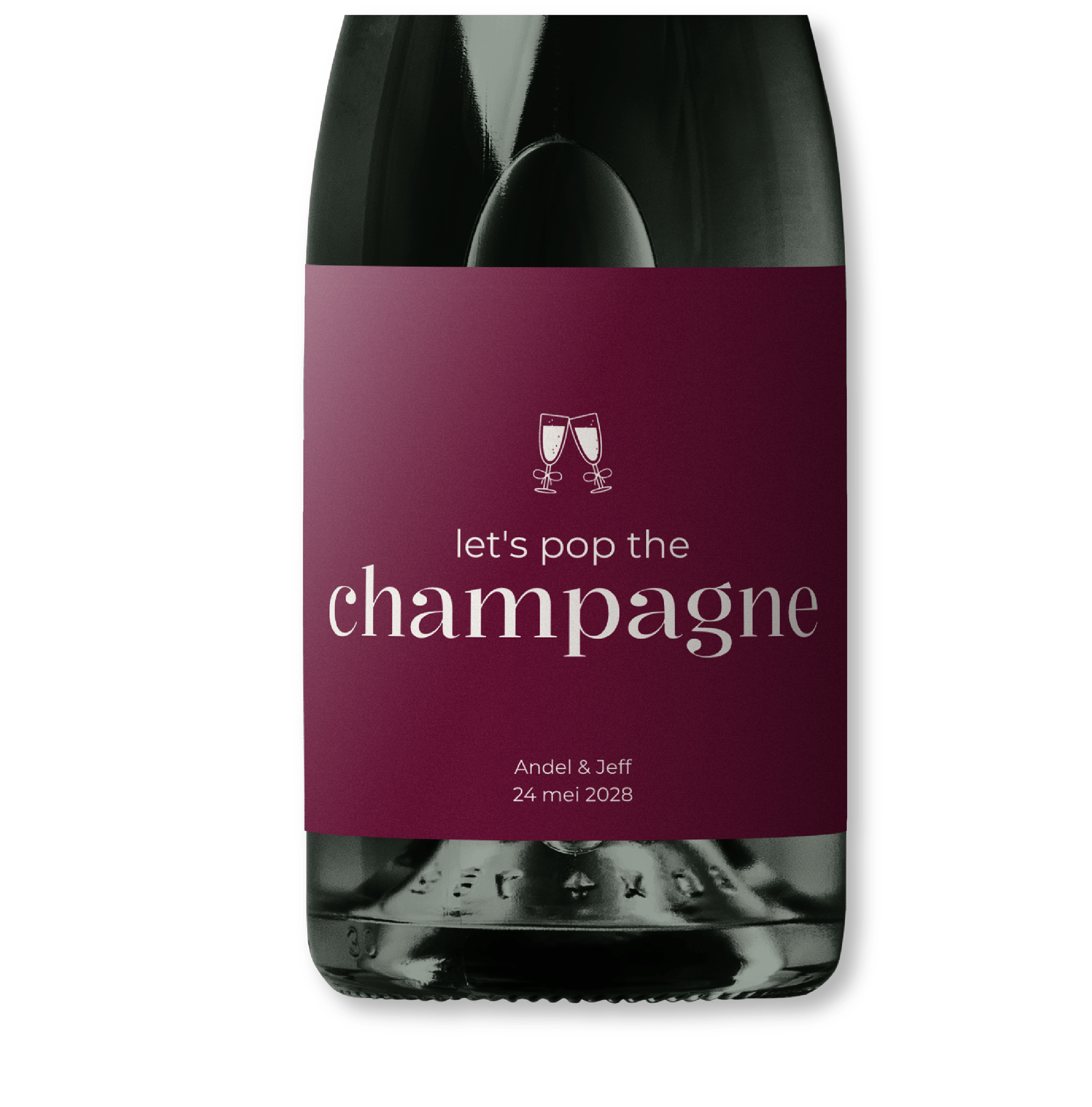 Breng jullie liefdevolle toost tot leven met dit champagne etiket uit de Love in Bordeaux collectie. De diepe wijnrode achtergrond straalt luxe en warmte uit, terwijl de stijlvolle witte typografie zorgt voor een modern en elegant contrast. De subtiele illustratie van klinkende glazen maakt het ontwerp feestelijk en vol betekenis.