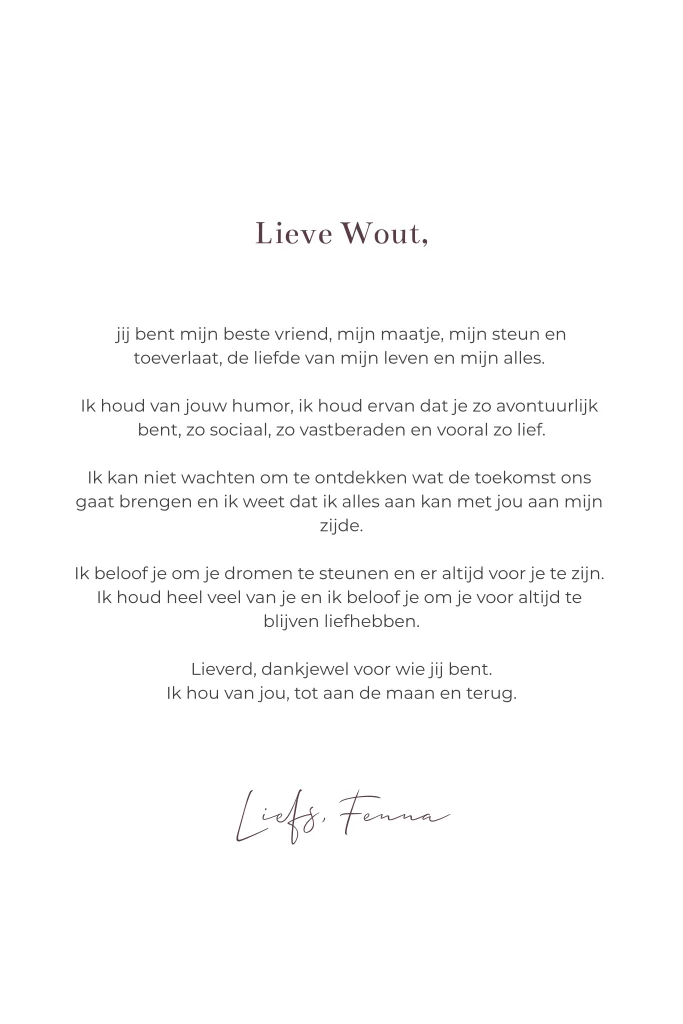 Het geloften boekje is volledig aan te passen aan het thema van jullie bruiloft. Pas kleuren, lettertypes en achtergronden eenvoudig aan in onze online kaarteneditor. Creëer een uniek ontwerp dat naadloos aansluit bij jullie persoonlijke stijl en het thema van jullie bruiloft.