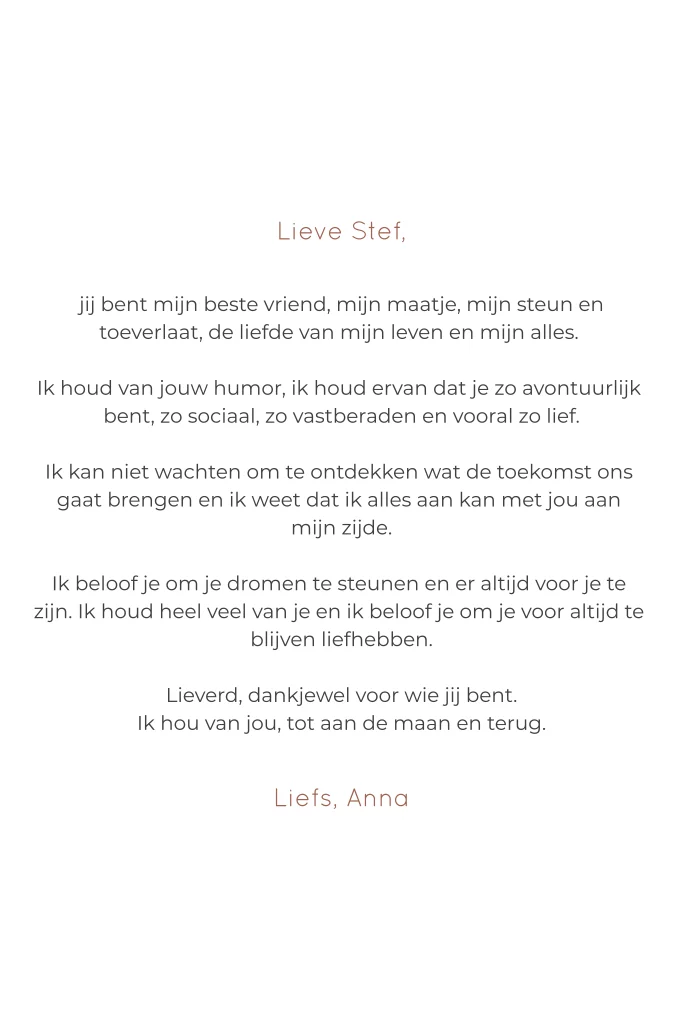 Een prachtig wit minimalistisch geloftenkaart in natuurlijke kleuren. Geef een persoonlijke touch aan jullie trouwdag door jullie geloften op te stellen in de stijl van jullie trouwkaart.
