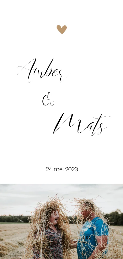 Een prachtige minimalistische jubileumkaart. Plaats een prachtige foto van jullie samen of gebruik een DIY fotolabel met een toffe paperclip. Je kunt de kaart geheel naar wens personaliseren. Het lettertype en de kleur kun je aanpassen. Voeg afbeeldingen of een achtergrond uit de beeldbank toe. Prachtig op zijdeglans of natuurkarton. Foto: KenT Fotografie.
