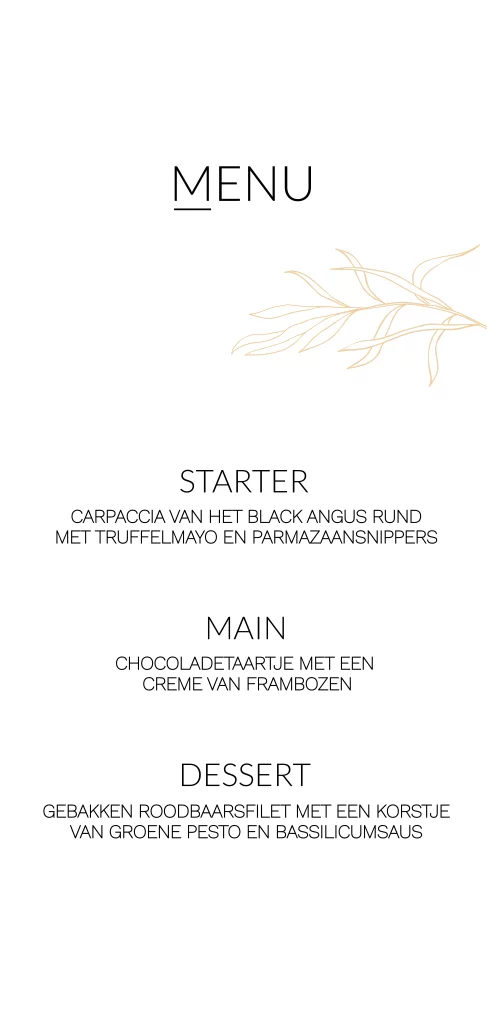 Een prachtige moderne menukaart met ronde hoeken. Het takje en de achterzijde van de menukaart is toegepast met een warme, zachte gele aarde tint. Het lettertype en de achtergrondkleur kun je naar wens aanpassen. Prachtig op Oud Hollands papier.