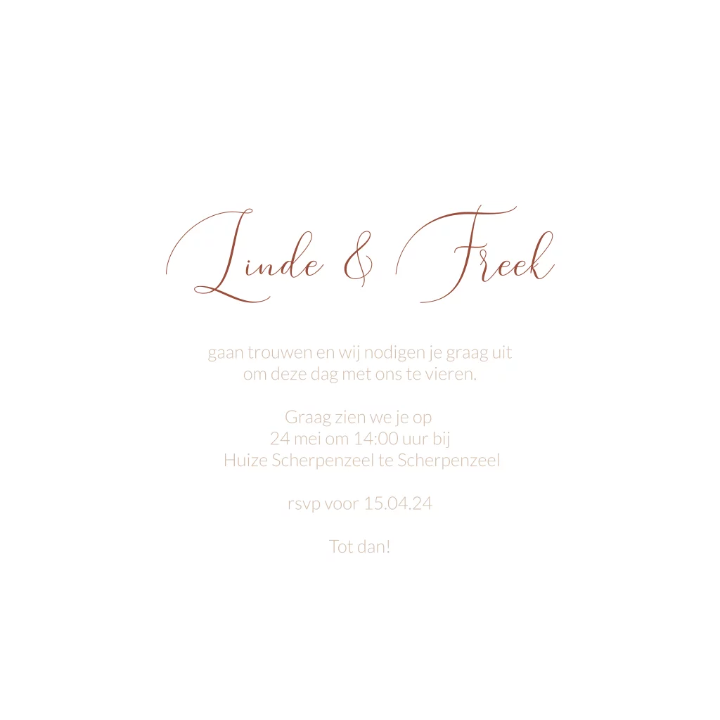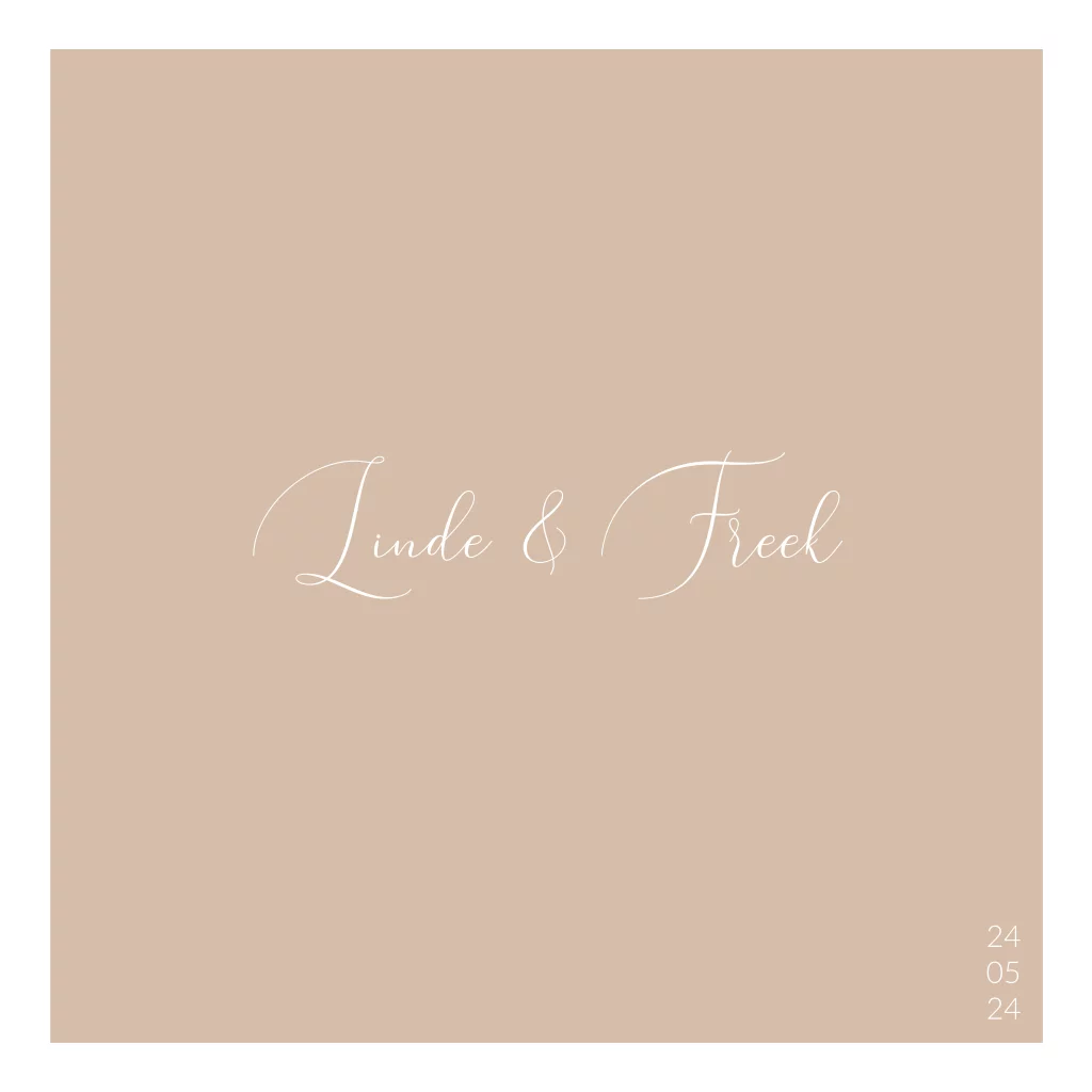 Nodig je gasten uit met deze prachtige minimalistische trouwkaart in zand kleur. De voorbeeldnamen Linde en Freek zijn in een kalligrafisch lettertype aangebracht. Je kunt de kaart helemaal naar wens aanpassen. Foto binnenzijde: KenT Fotografie.